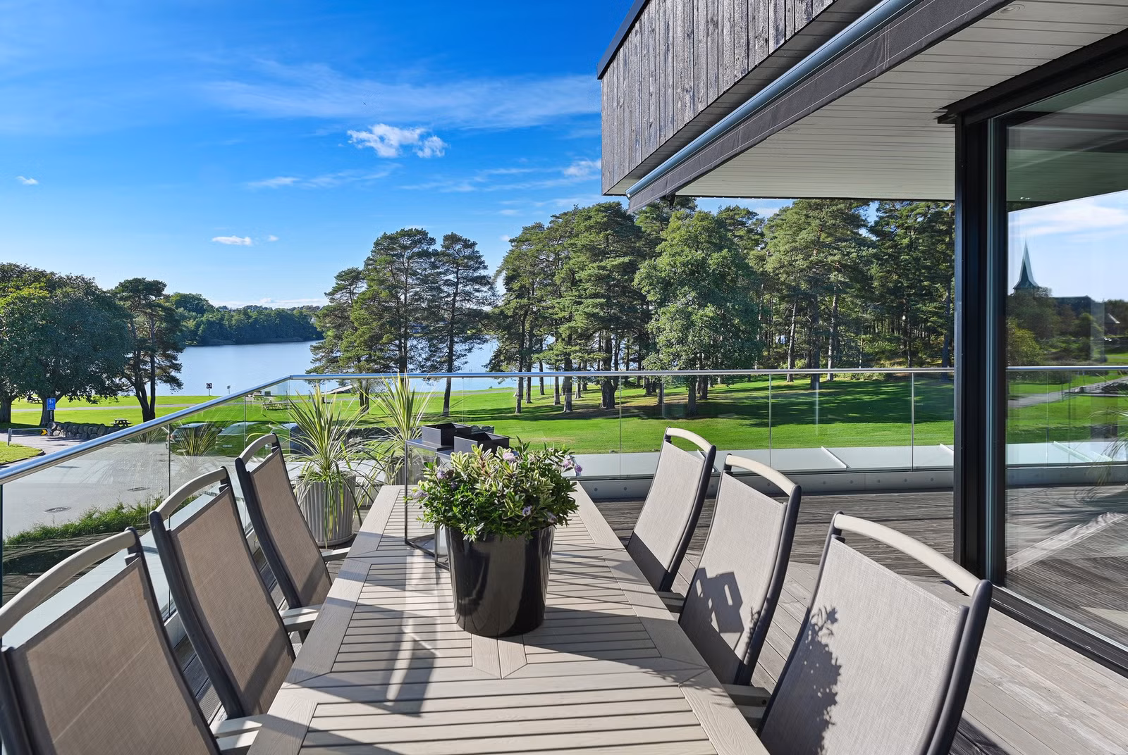 Leiligheten ligger i et sameie bestående av 4 seksjoner, og leiligheten utgjør hele 2. etasje alene. Beliggenheten er meget attraktiv, med Tunevannet som nærmeste nabo. Leiligheten er skjermet for innsyn, og det er utvendig trapp til en stor tilhørende takterrasse.