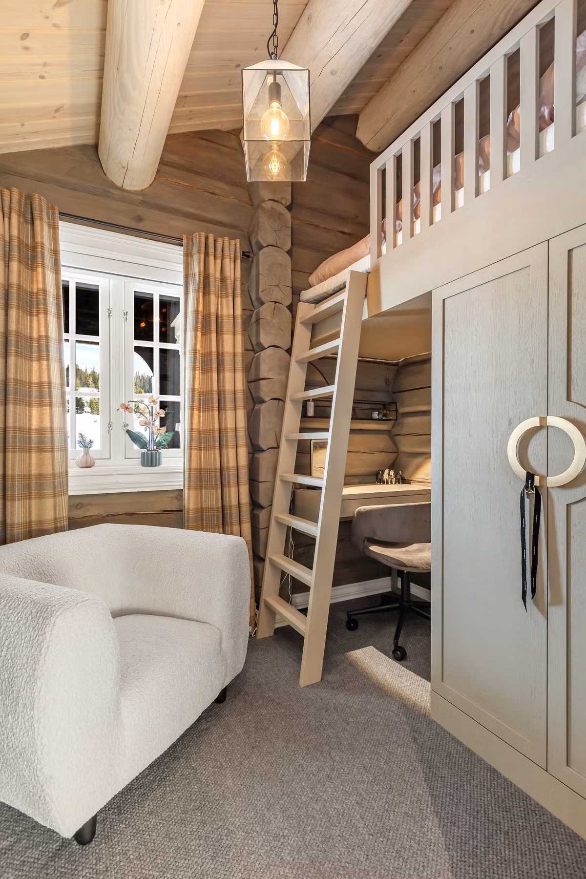 Den åpne stuen har imponerende takhøyde, synlige takåser og en flott peis som skaper den ultimate hyttestemningen. Nyere og flott kjøkken fra Kvänum med lyse profilerte fronter, steinbenkeplate og integrerte hvitevarer fra Gaggenau. Spisestuen er romslig, ideell for sosiale sammenkomster.