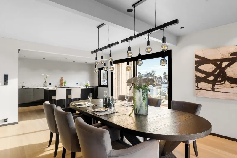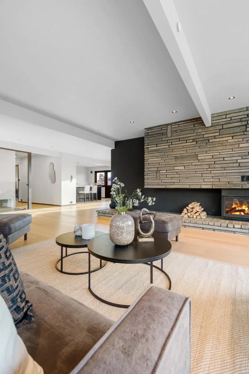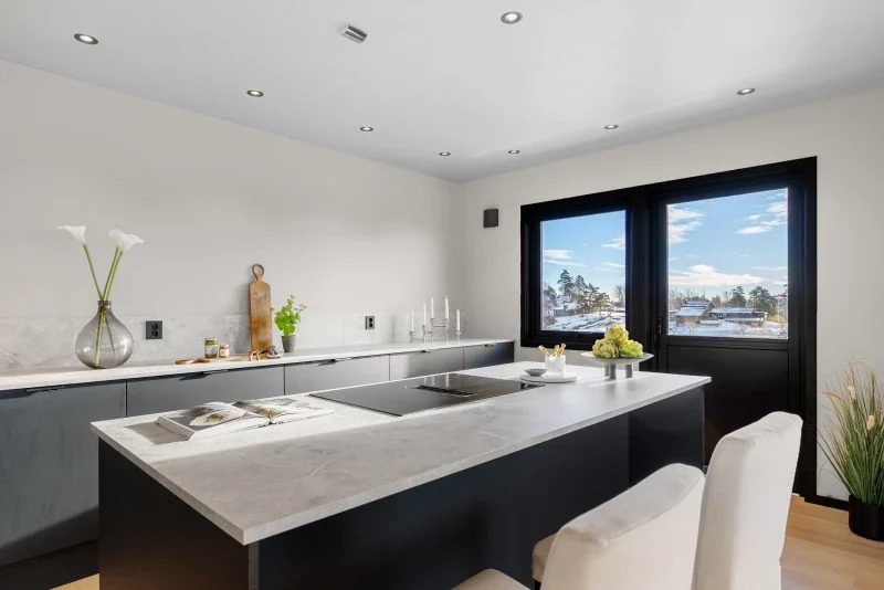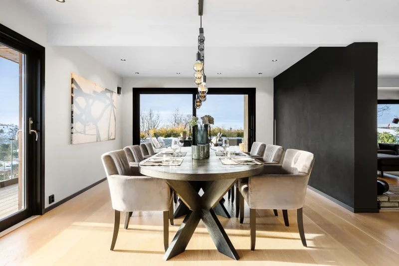 Husets hjerte er i stuen - denne må oppleves. Her kan man nyte store vindusflater og ikke minst flott utsikt. Kjøkkenet er beliggende i en delvis åpen løsning mot spisestue og framstår særlig luftig og lys. For familiens kokk, er dette her en drømmeplass. Gjestene kan glede seg til dine flotte retter i den tilhørende spisestuen. Videre går man ut til den fantastiske terrassen som innbyr til uteliv. Her kan du skaffe deg din drømmeplass.